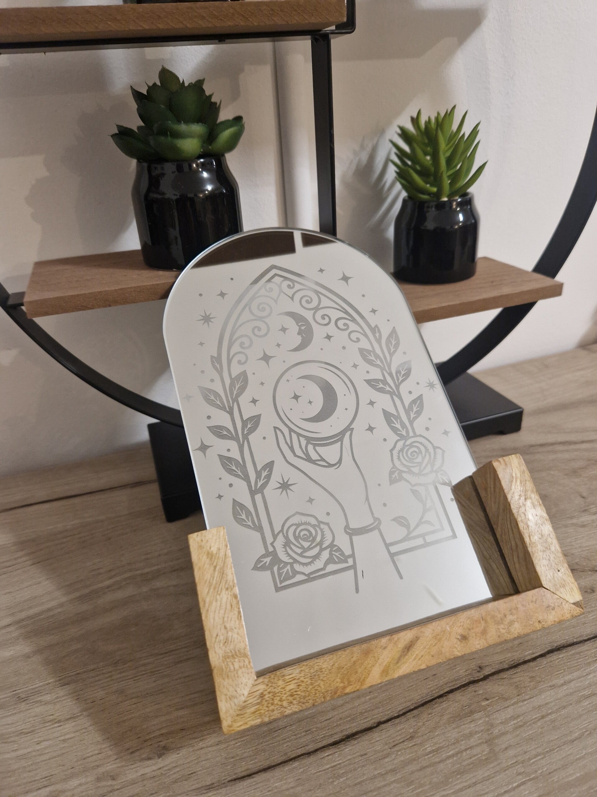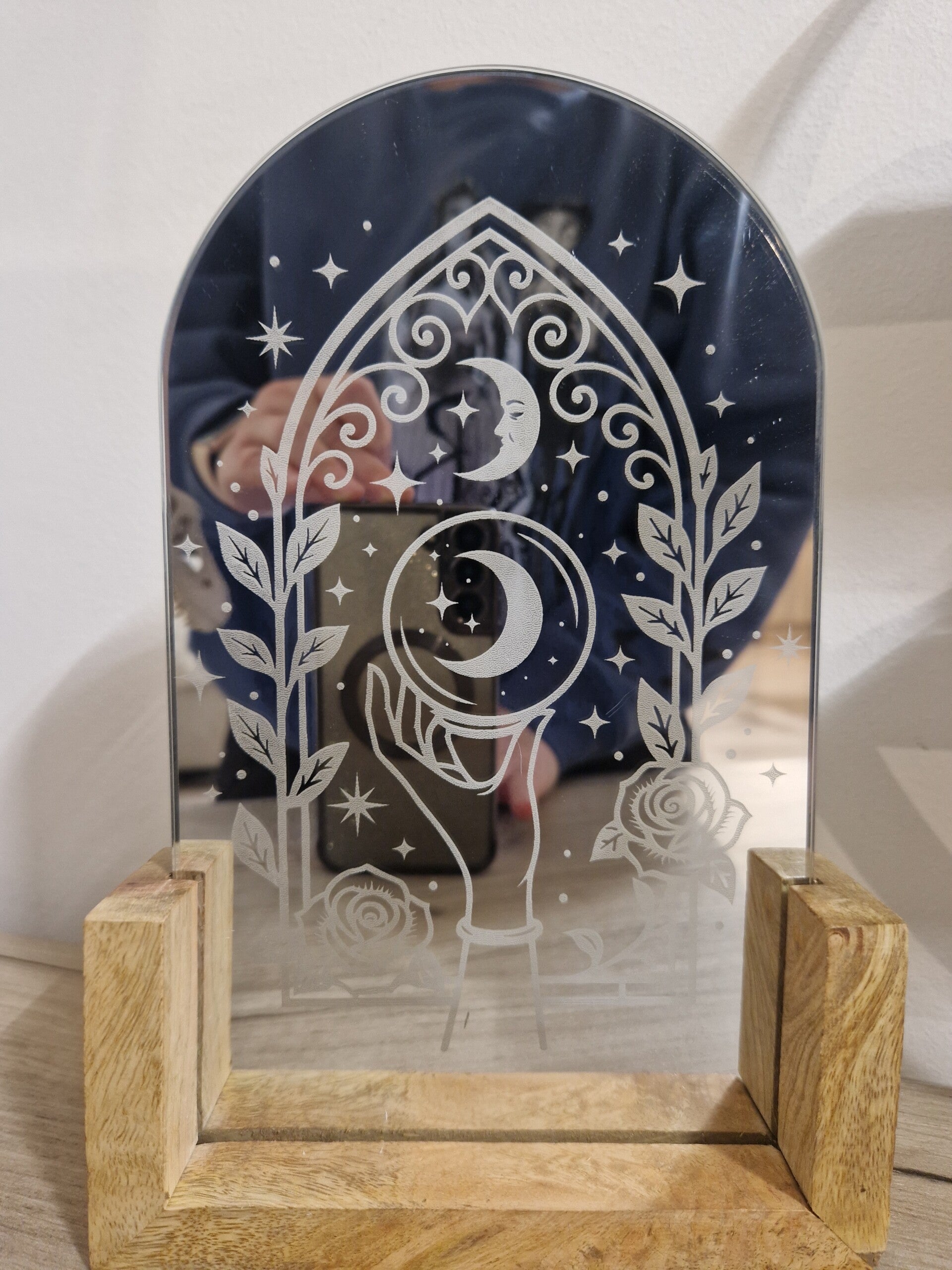 Miroiren verre mystique et envoûtant représentant une main tenant la lune dans un cadre en vitrail gothique orné de roses et d'étoiles.